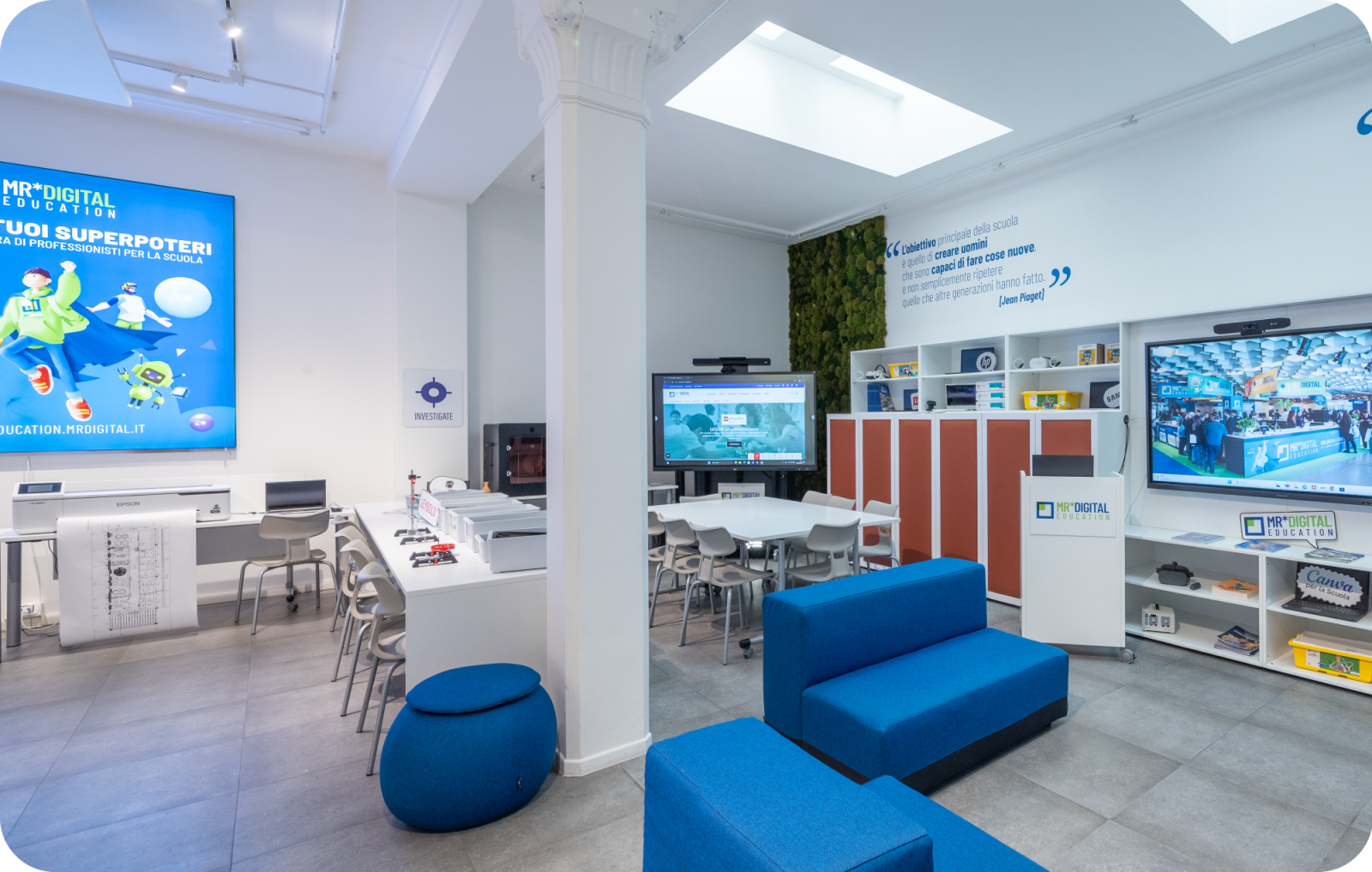 Situato in Viale Vittorio Veneto 30 a Milano, il nostro spazio espositivo nasce dall’idea di portare la scuola oltre i confini dell’aula tradizionale. Ispirato ai modelli europei dei Future Classroom Lab e sviluppato con partner d’eccellenza, lo showroom MR Digitalè un laboratorio aperto dove progettare, sperimentare e immaginare insieme la scuola che verrà. Qui trovano posto: