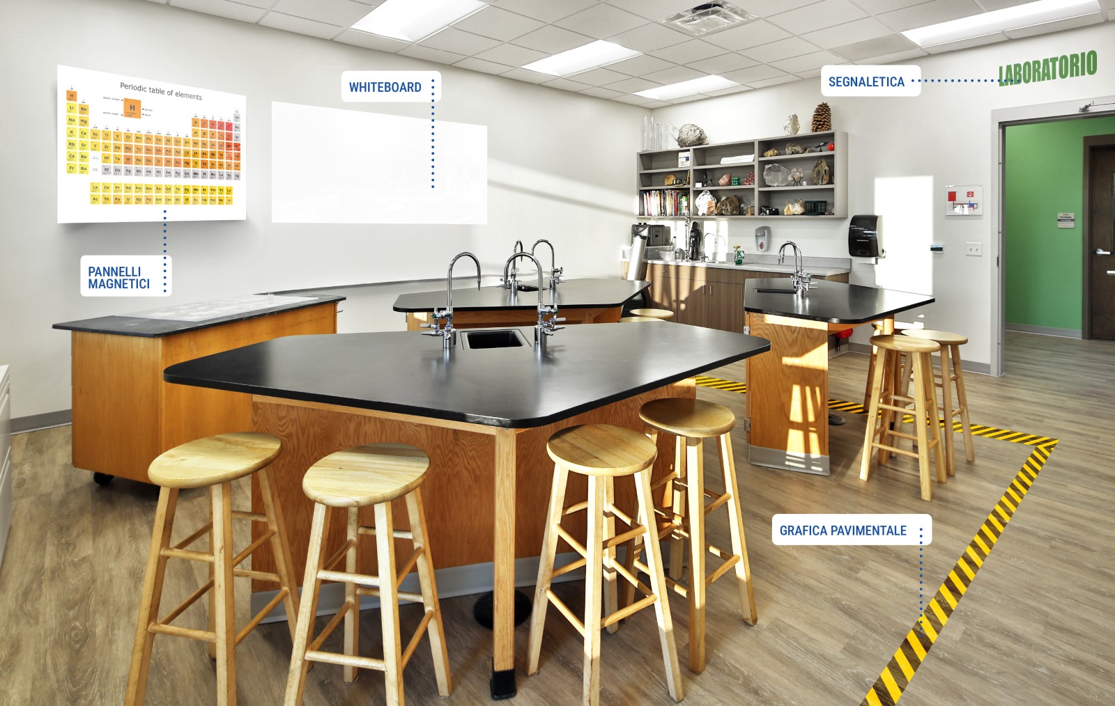 Infine strumenti come pellicole scrivibili (whiteborad) e pannelli magnetici rendono le lezioni più dinamiche.