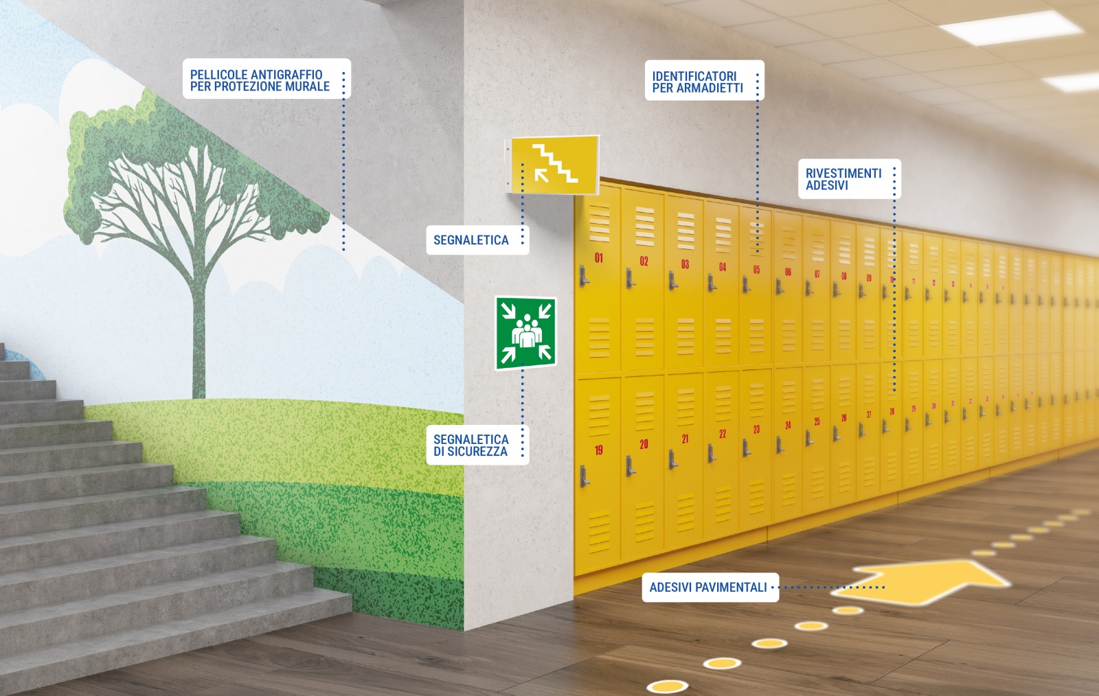 Questi elementi contribuiscono a creare un ambiente scolastico ordinato e facilmente navigabile, migliorando l’esperienza all’interno della scuola e aiutando i ragazzi a sviluppare il senso di orientamento.