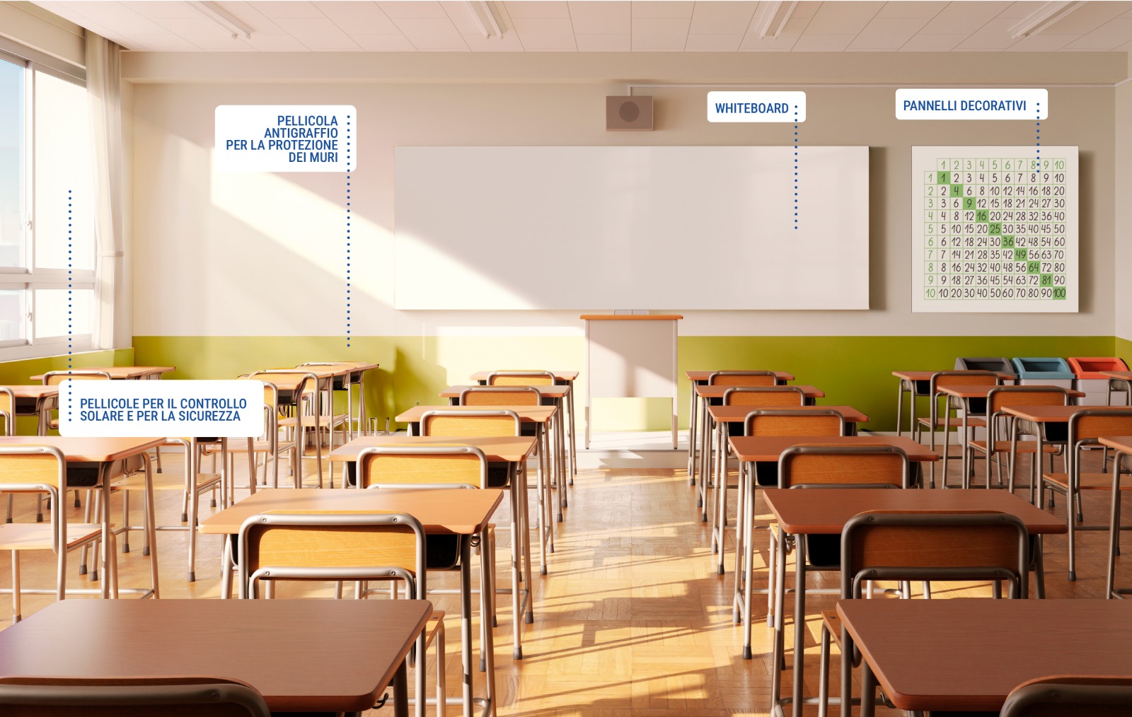 Con la sua superficie liscia e uniforme, gli insegnanti possono creare presentazioni dinamiche e creare lavori di gruppo coinvolgenti per gli studenti. La pellicola è poi facilmente cancellabile e la superficie è rescrivibile con i pennarelli ad acqua. infine è facile da installare e rimuovere, non danneggia la superficie dell’aula, ed è resistente ai graffi e all’usura quotidiana, proteggendo quindi anche l’arredo.